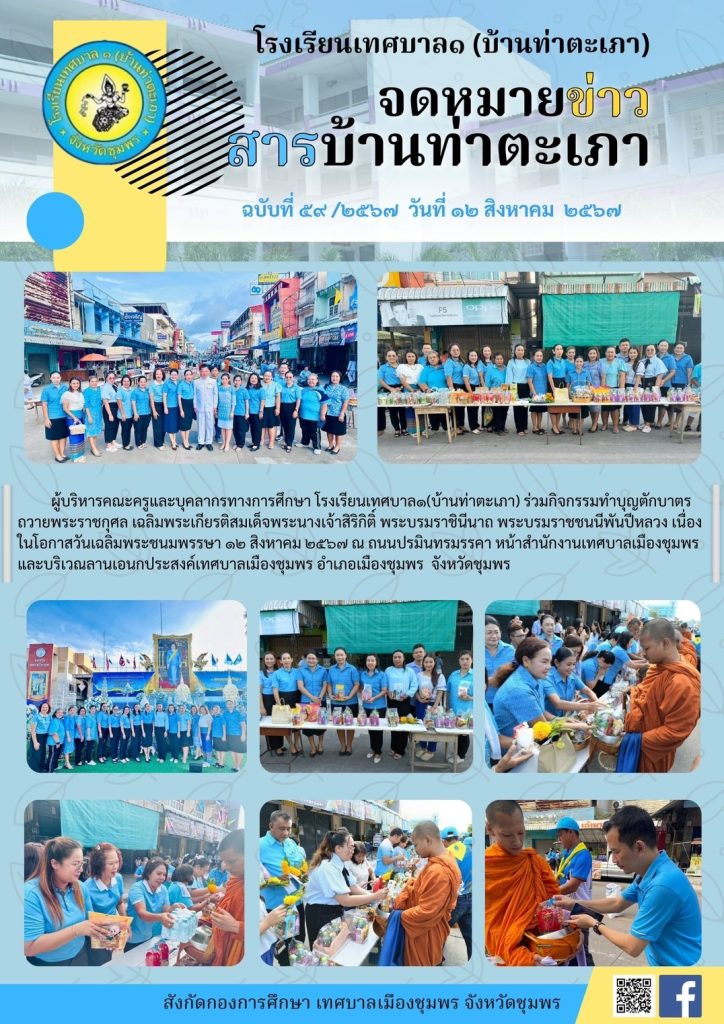 นางสาวศิริรัตน์ ชูชีพ รองผู้อำนวยการสถานศึกษา คณะครูและบุคลากรทางการศึกษา โรงเรียนเทศบาล ๑ (บ้านท่าตะเภา) ร่วมกิจกรรม ทำบุญตักบาตรถวายพระราชกุศล